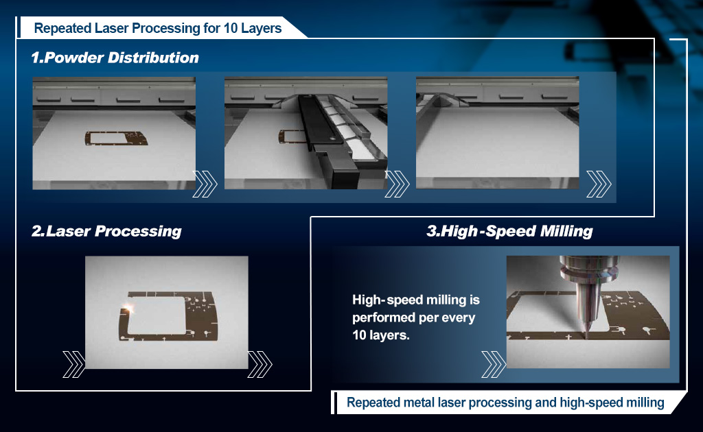 Laser processing solidifies the powder layer on the processing table. When processing is finished, the processing table is lowered and metal powder for the next layer is distributed by the distribution unit. The laser then irradiates this powder to complete the next layer. The processes 1 and 2 are repeated 10 times and then milling starts.